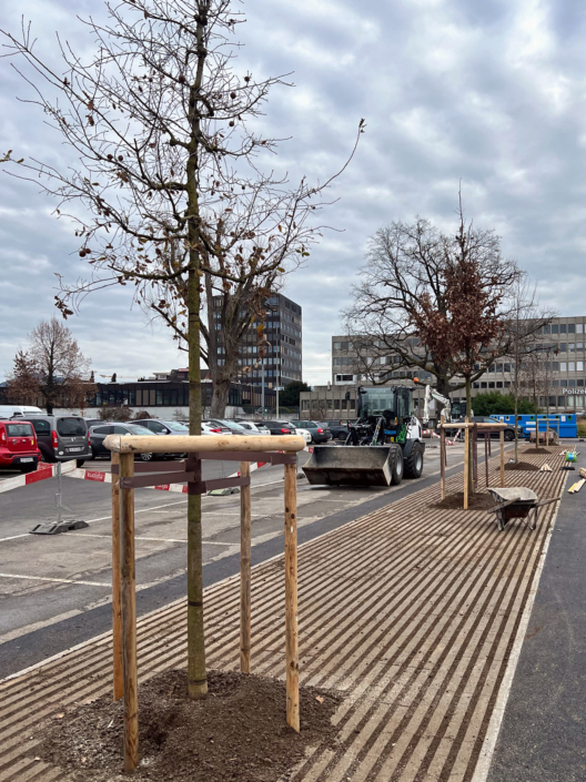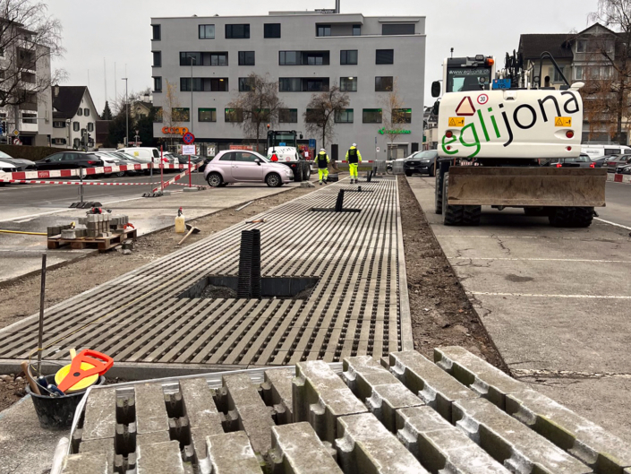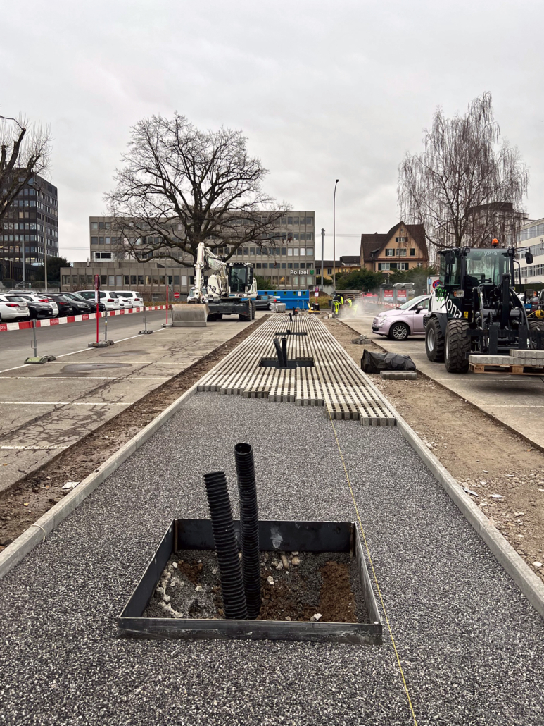 Zwischen den Parkfeldern entsteht ein entsiegelter Bereich bestehend aus Rasenliner, welcher das Wasser auffängt, speichert und den neu gepflanzten Bäumen zur Verfügung stellt.