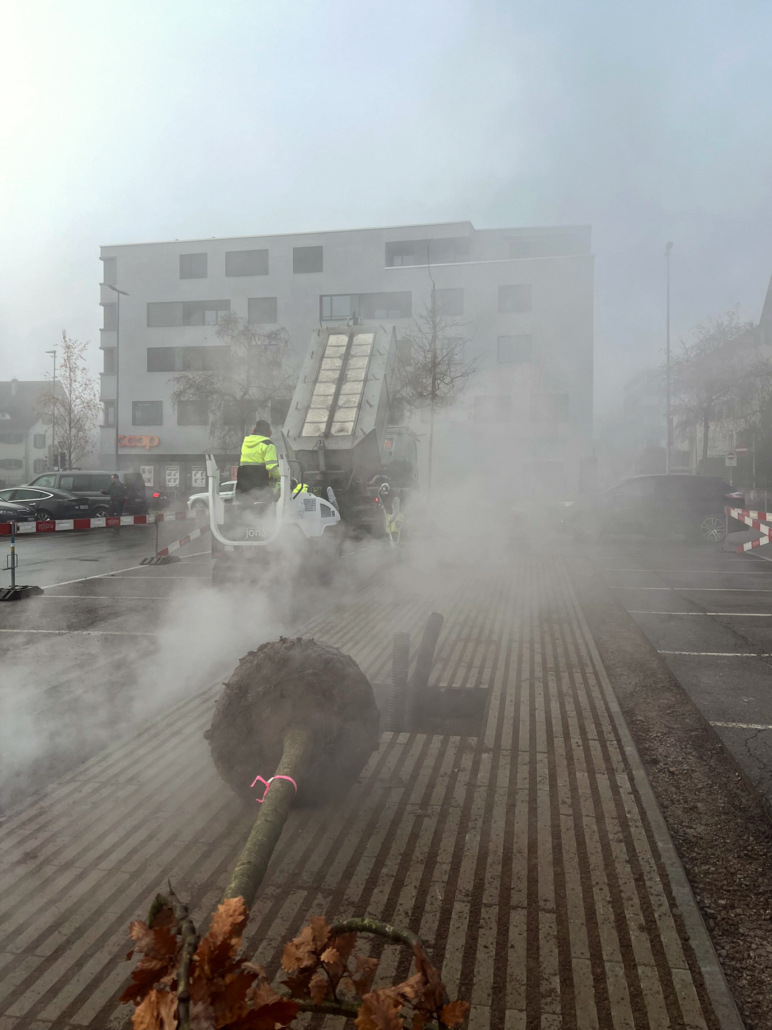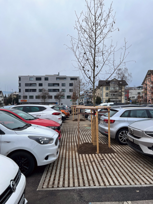 Die 15 neuen Bäume sind ausschliesslich einheimisch, sowie trockenheits- und hitzeresistent. Durch die Transpiration und ihre Funktion als Schattenspender, entsteht auf dem Parkplatz ein gekühltes Mikroklima.