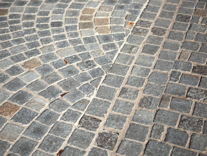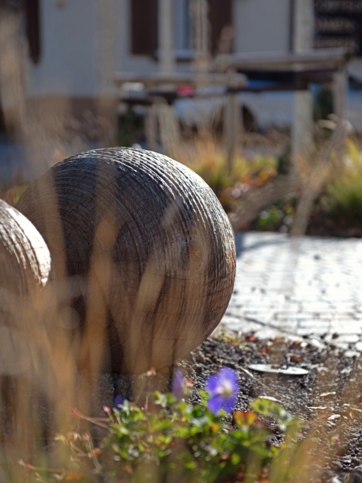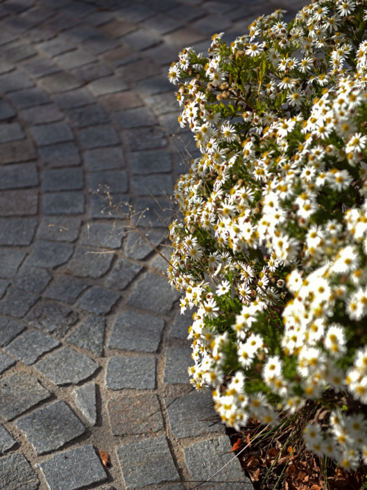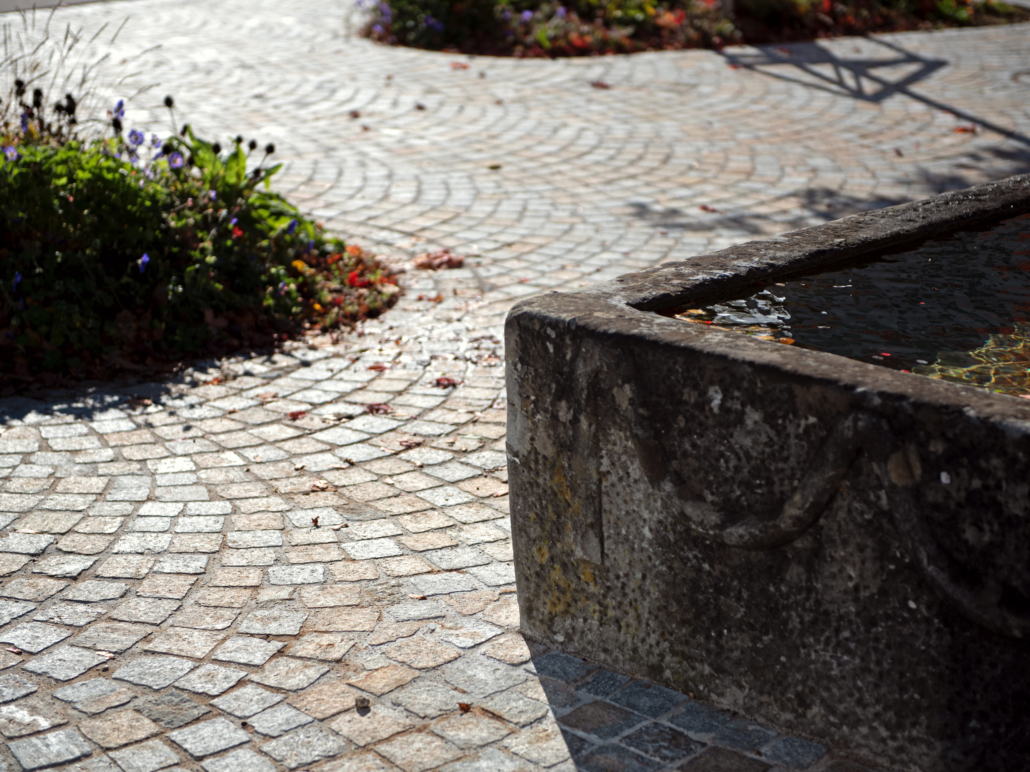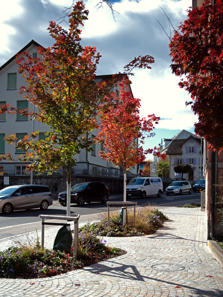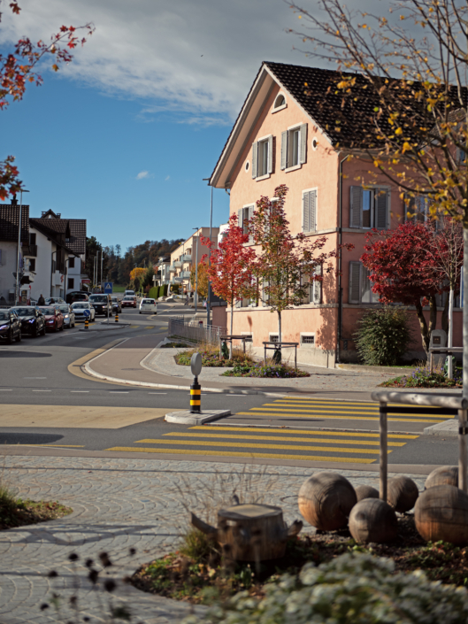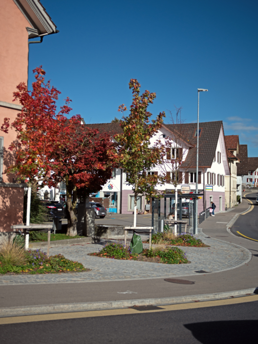 Die Hartflächen sind mit einer Luserna-Pflästerung materialisiert, welche sich optimal in das ländliche Dorfzentrum einfügt. Die dreireihigen Abschlüsse entlang der Grenze schaffen einen optischen Rahmen und fassen den Raum. Auch die grosszügigen, im Schwammstadt-Prinzip ausgeführten Baumgruben werden durch einen zweireihigen Abschluss gefasst. Die Baumgruben werden üppig bepflanzt mit verschiedenen Staudenmischungen, was zum einen die Biodiversität fördert und zum anderen den Platz auflockern.